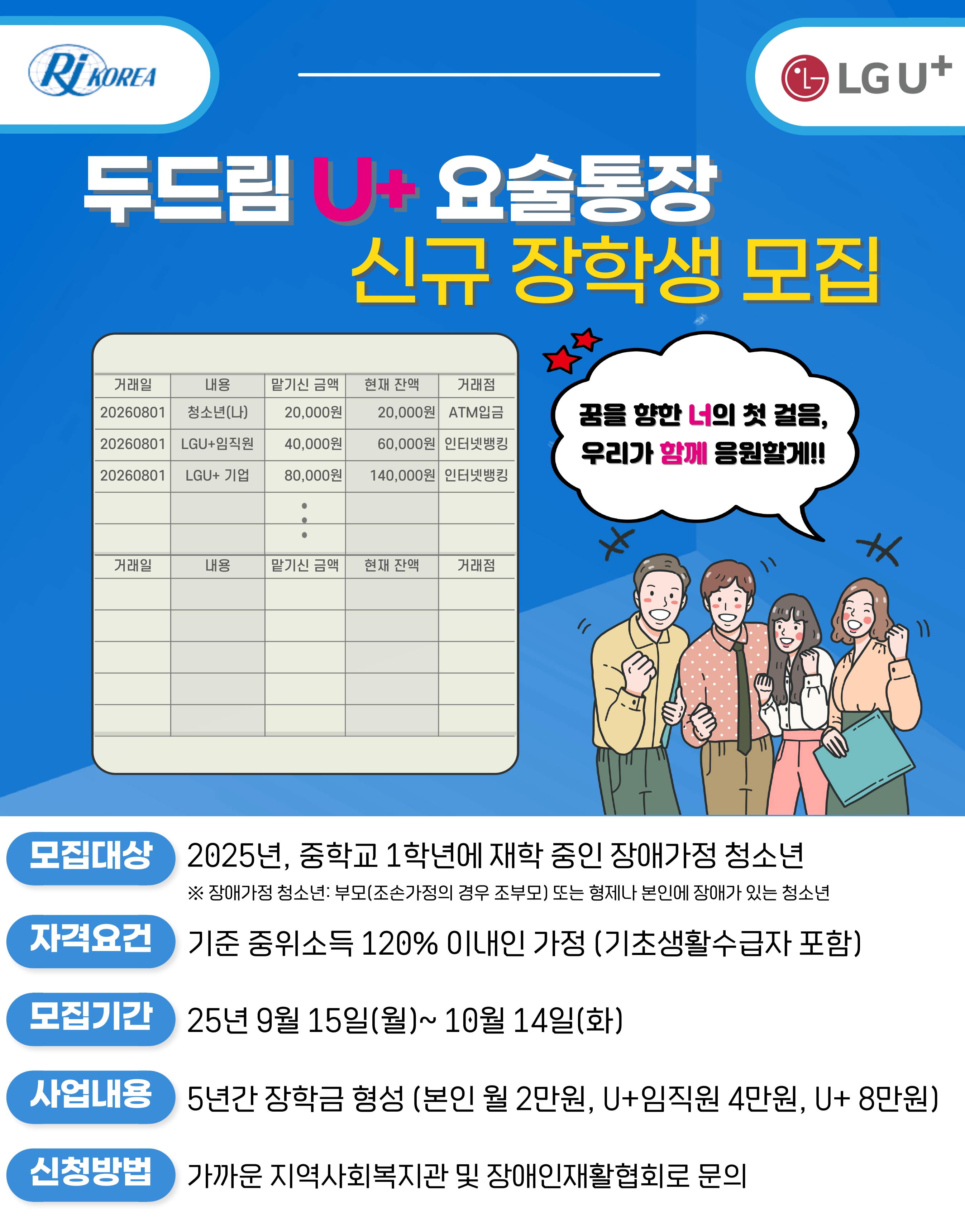 1. ½Åû´ë»ó °¡. ÁßÇб³ 1Çг⿡ ÀçÇÐ ÁßÀÎ Àå¾Ö°¡Á¤ û¼Ò³â ³ª. 2025³â ±âÁØ ÁßÀ§¼Òµæ 120% À̳» ´Ù. ±¸Ã¼ÀûÀÎ Áø·Î ¸ñÇ¥¿Í ½Çõ ÀÇÁö°¡ Àִ û¼Ò³â ¶ó. ¿ä¼úÅëÀå Ȱµ¿(¸àÅ丵 ¹× Ä·ÇÁ)¿¡ Àû±ØÀûÀ¸·Î Âü¿©ÇÒ Ã»¼Ò³â ¸¶. 5³â µ¿¾È ¸Å¿ù Á¤±â ÀúÃà(¿ù 20,000¿ø)À» À¯ÁöÇÒ ÀÇÁö°¡ ÀÖ´Â °¡Á¤ ´Ù. Àü±¹ 15°³ LGU+»ç¾÷Àå ¼ÒÀçÁö ÀαÙÁö¿ª ¿ì´ë ¡Ø LGU+ 15°³ »ç¾÷Àå : ¼¿ï 5°÷(¿ë»êº»»ç, ¼Ãʹæ¹è, ±Ýõµ¶»ê, ¸¶Æ÷»ó¾Ï, °¼¸¶°î), ÀÎõ 1°÷(ÀÎõ°£¼®), °æ±â 2°÷(¾È¾ç, ¼ö¿øÀΰè), ´ë±¸ 4°÷(´ë±¸µ¿ÀÎ, È¿¸ñ, ´ë±¸½Åõ, ´ë±¸È²±Ý),ºÎ»ê 1°÷(ºÎ»êÃÊ·®), ±¤ÁÖ 1°÷(±¤ÁÖ±¤Ãµ), ´ëÀü 1°÷(´ëÀü¿À·ù) 2. ¼±¹ß °úÁ¤ È«º¸ ¹× Á¢¼ö 25. 9. 15.(¿ù) ~ 10. 13.(¿ù) | | ¡Û ¸ðÁý´ë»ó: Àå¾Ö°¡Á¤ ÁßÇб³ 1Çгâ û¼Ò³â ¡Û ½Åû¹æ¹ý: Çʿ伷ù Áغñ ÈÄ ±â°ü ´ã´çÀÚ°¡ ±â°£ ³» ¸ÞÀÏ Á¦Ãâ gom@gomduri.kr ¡Û Á¦Ãâ¼·ù: ÇÏ´Ü [Á¦Ãâ¼·ù] ¾È³» Âü°í | ¡é | | | 1Â÷ ¼·ù½É»ç 25. 10. 20.(¿ù) ~ 10. 22.(¼ö) | | ¡Û Çùȸ ÀÚü ¼·ù½É»ç ÁøÇà ¹× 45¸í(1.5¹è¼ö) ¼±¹ß | ¡é | | | 2Â÷ ¼±Á¤È¸ÀÇ 10¿ù 4ÁÖ ¿¹Á¤ | | ¡Û ¼±Á¤È¸ÀÇ ÁøÇà * ¸éÁ¢ ÁøÇà(ÇʼöÂü¼®, ÇÊ¿ä ½Ã »ç·Ê°ü¸®ÀÚ µ¿Çà) - Àå¼Ò: Çѱ¹Àå¾ÖÀÎÀçȰÇùȸ ¿¹Á¤ * ¸éÁ¢ Âü¼® ½Ã, ¼ÒÁ¤ÀÇ È¸ÀǺñ/ ±³Åëºñ Áö±Þ (±³ÅëºñÀÇ °æ¿ì ¼¿ï, °æ±â, ÀÎõ Áö¿ªÀº ¹ÌÁö±ÞÇÔ) | ¡é | | ÃÖÁ¾ ¼±Á¤ ¾È³» 11¿ù 2ÁÖ À̳» | | ¡Û Çѱ¹Àå¾ÖÀÎÀçȰÇùȸ ȨÆäÀÌÁö ¹× °³º°Å뺸(ÃÑ 30¸í ¼±¹ß) |